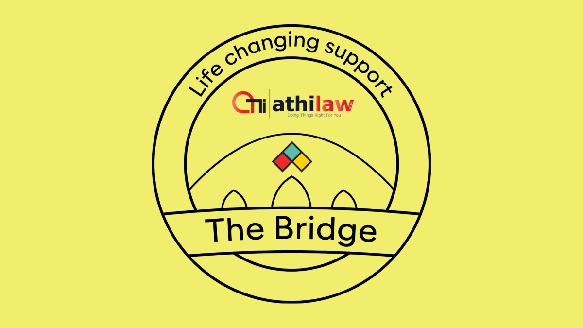 Image with headline: Set against a bright yellow background, The Bridge logo is a black circular double outline with text reading "Life changing support" on the inside at the top and "The Bridge" on a banner across the circle at the bottom. Inside the middle circle is the outline of a bridge, with three archways underneath, and above the middle archway is the triangular Archer Project logo with its three main colours of red, teal and yellow. In the space above the outline of a bridge is Athi Law's logo.