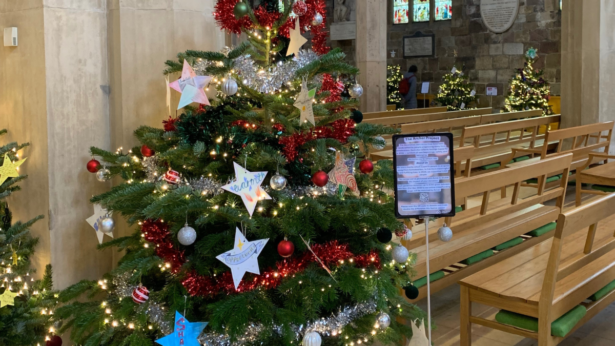 Image with headline: A Christmas tree inside Sheffield Cathedral, decorated with red and silver tinsel, baubles in various colours, and warm white string lights. The main feature of the decoration is the star-shaped ornaments with hand drawn and written messages made by people supported at The Archer Project. A small sign on a stand is positioned to the right of the tree. In the background are wooden pews, stone columns and stained glass windows illuminated by the daylight.